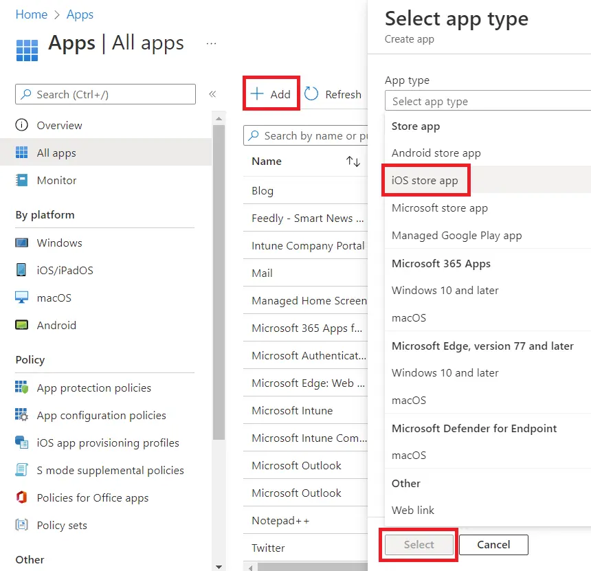 Next, navigate over to Apps, All apps, click Add, and select iOS store app.