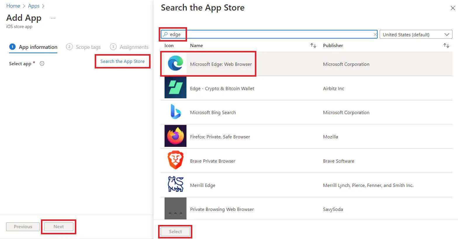 Click on Search the App Store, search for Edge, click Microsoft Edge: Web Browser, click Select, review settings you might want to change, then click Next.