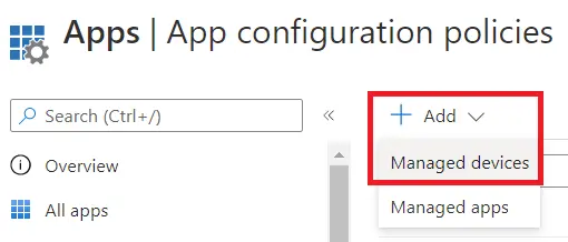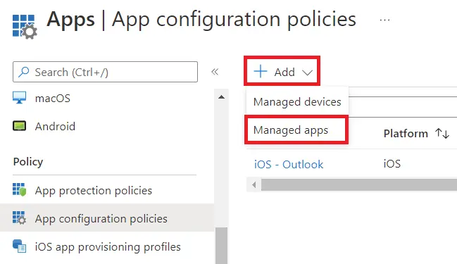 Next, in the Apps section of Intune, scroll down under Policy and click App configuration policies. Click Add and select Managed apps from the dropdown.