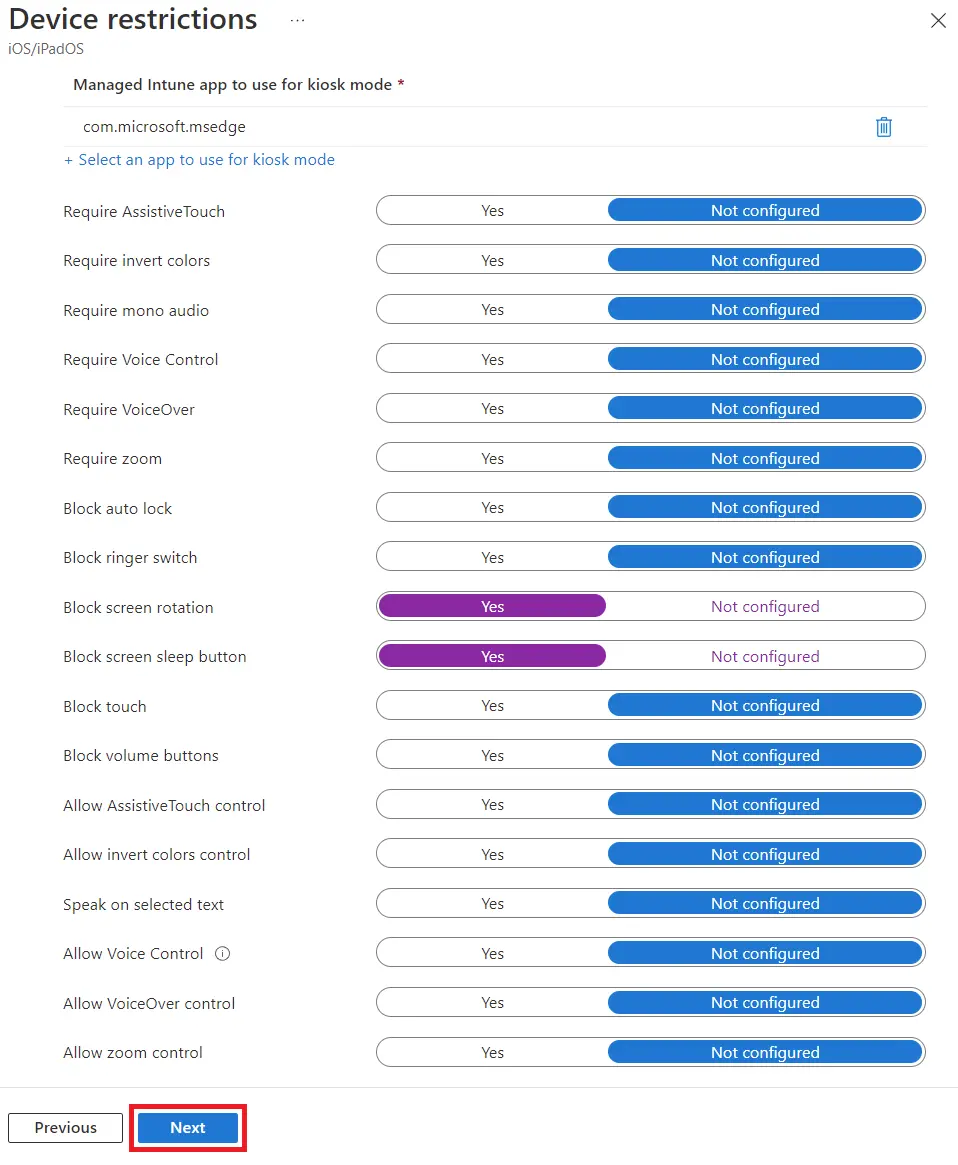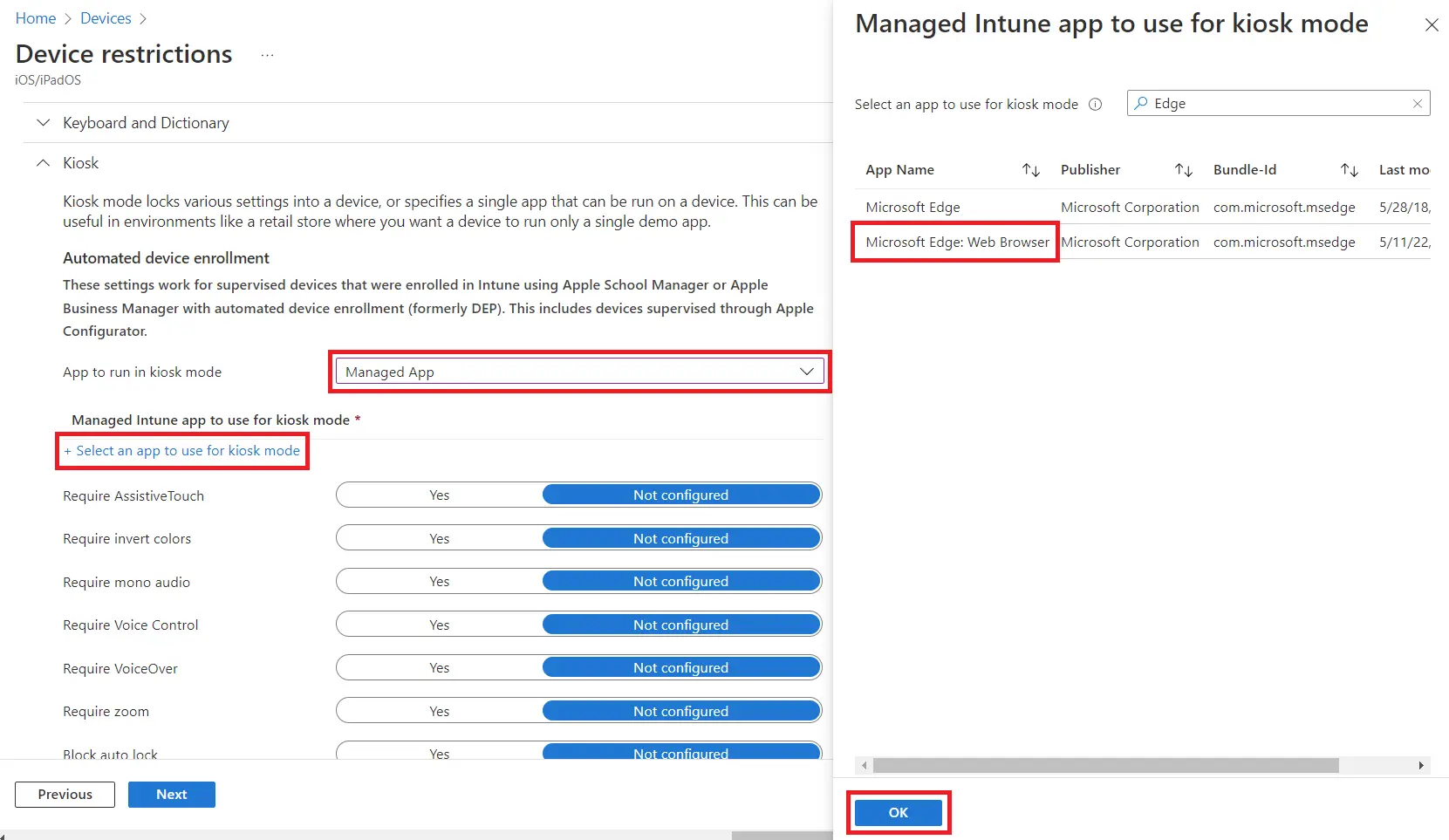 During my research, I found this Microsoft Doc on Manage Edge for iOS and Android with Intune, but it was not clear to me on how I could achieve what I wanted. Initially I saw Kiosk Mode was only available for Android, but I decided to try it anyway to see if the Docs just hadn’t been updated. While it didn’t work, the process did give me other ideas to play with resulting in the following solution: