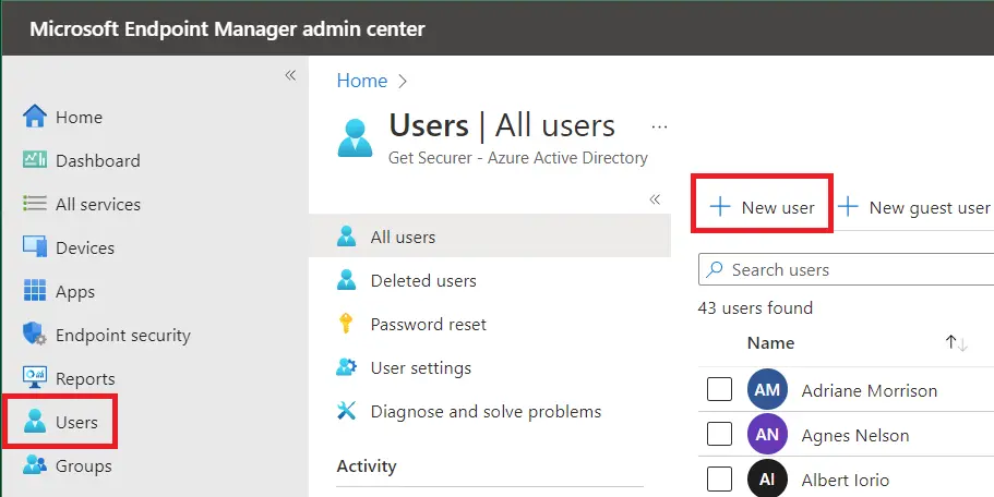 First, let’s create a kiosk user that will be used to sign into the iPad. We need to do this because not all App configuration policies apply to managed devices (more on this later). So let’s sign into Intune, go under Users, and click New user.