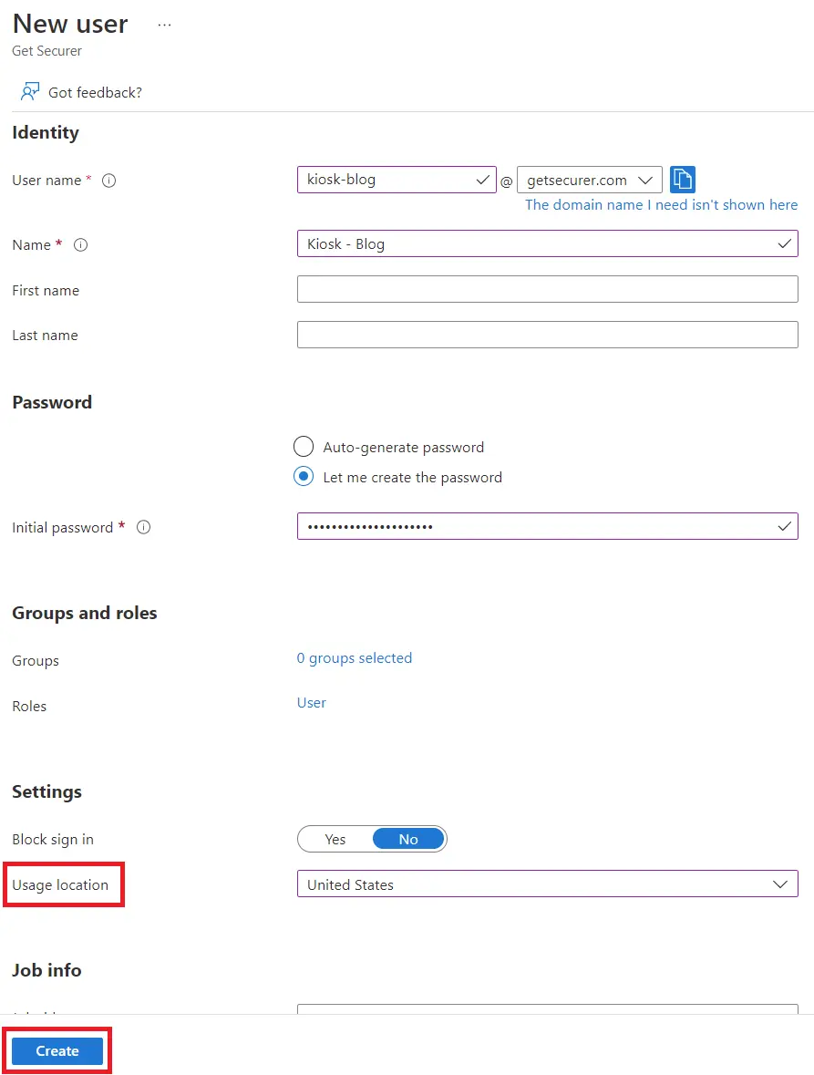 On the next screen, provide a user name, display name, set an initial password, set the usage location, and then click Create.