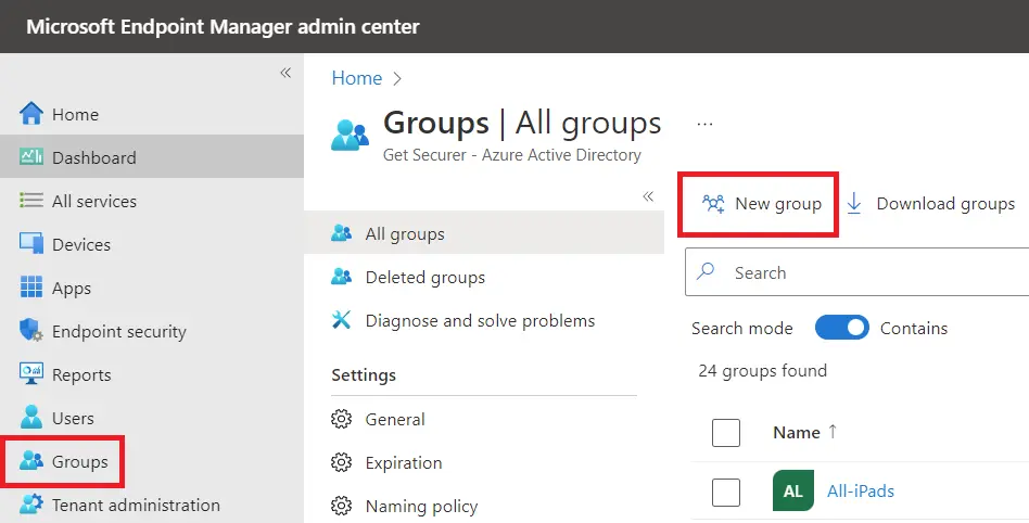 Next, create two security groups - one for the kiosk user and one for the kiosk devices. In Intune, go under Groups, then click on New group.
