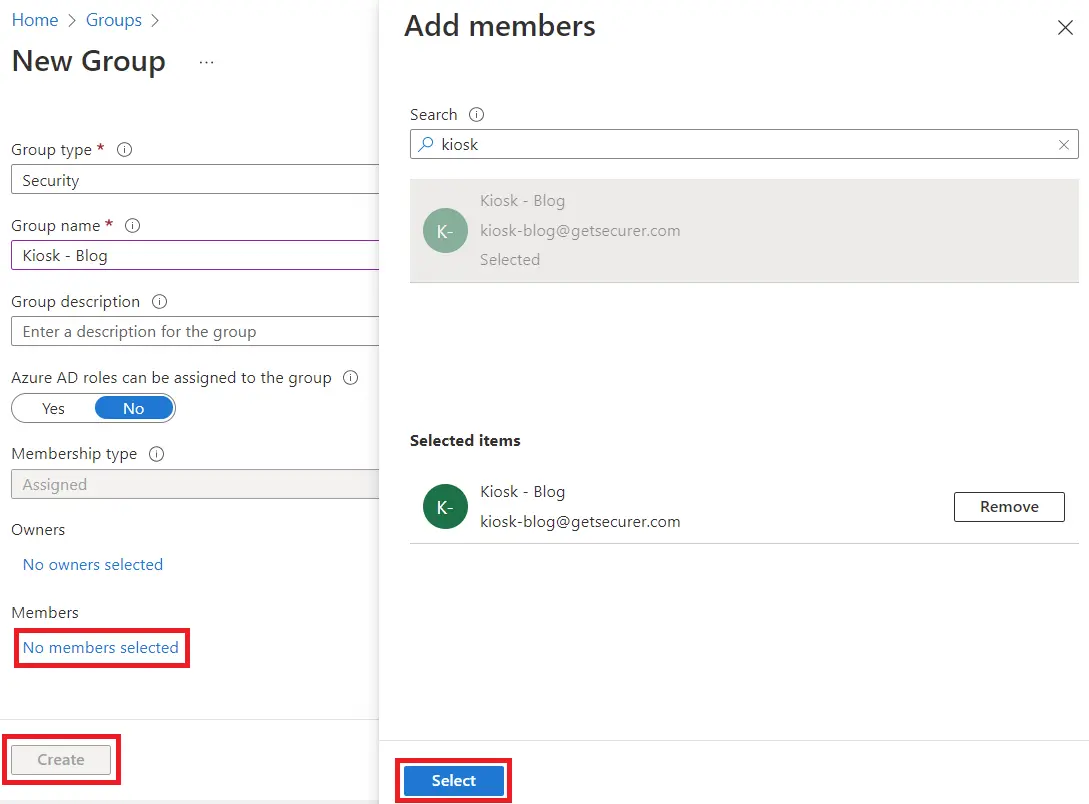Give the group a name that will help you remember what it is used for (🤪), click on “No members selected”, add the kiosk user, click Select, then click Create.