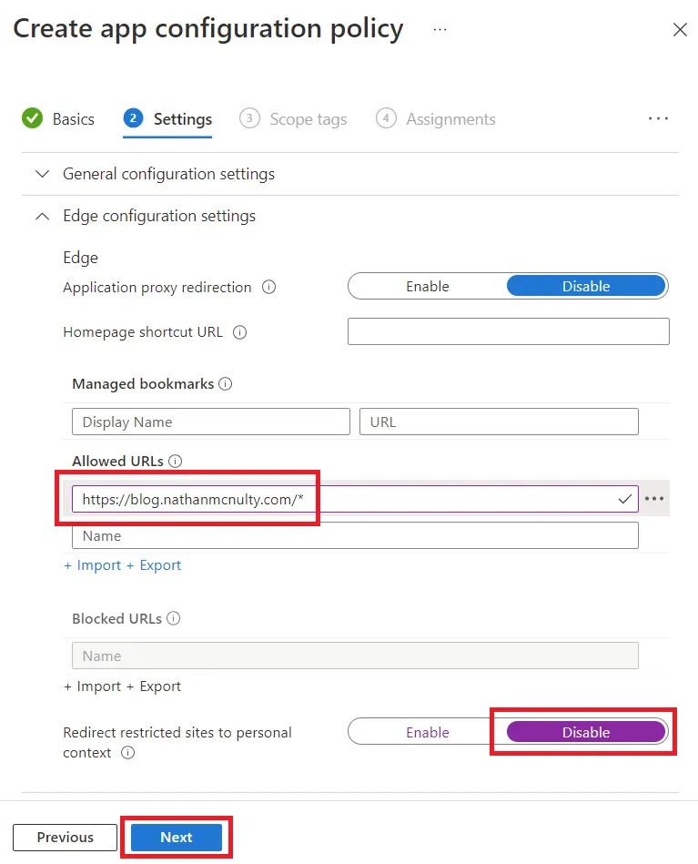Edge is one of a few special apps that have pre-built policy definitions. Expand Edge configuration settings, then use Allowed URLs to limit browsing and Disable Redirect restricted sites to personal context. Be careful to include /* in allowed URLs if you want the full site to be accessible.