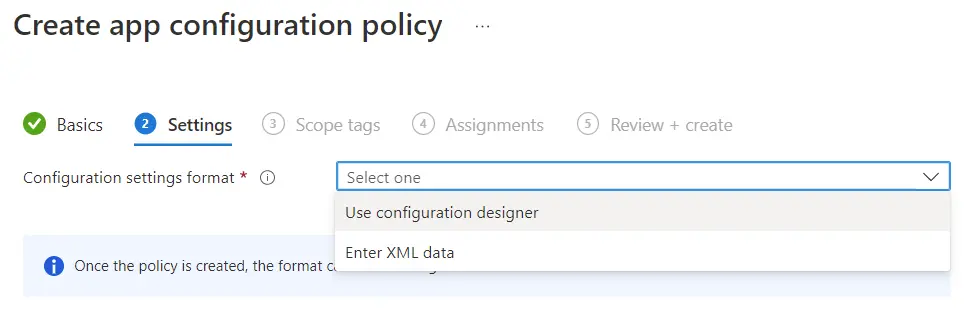 Click Next when finished, set scope tags if you use them, click Next, assign the policy to our devices group, then click Next, then review and Create the policy.