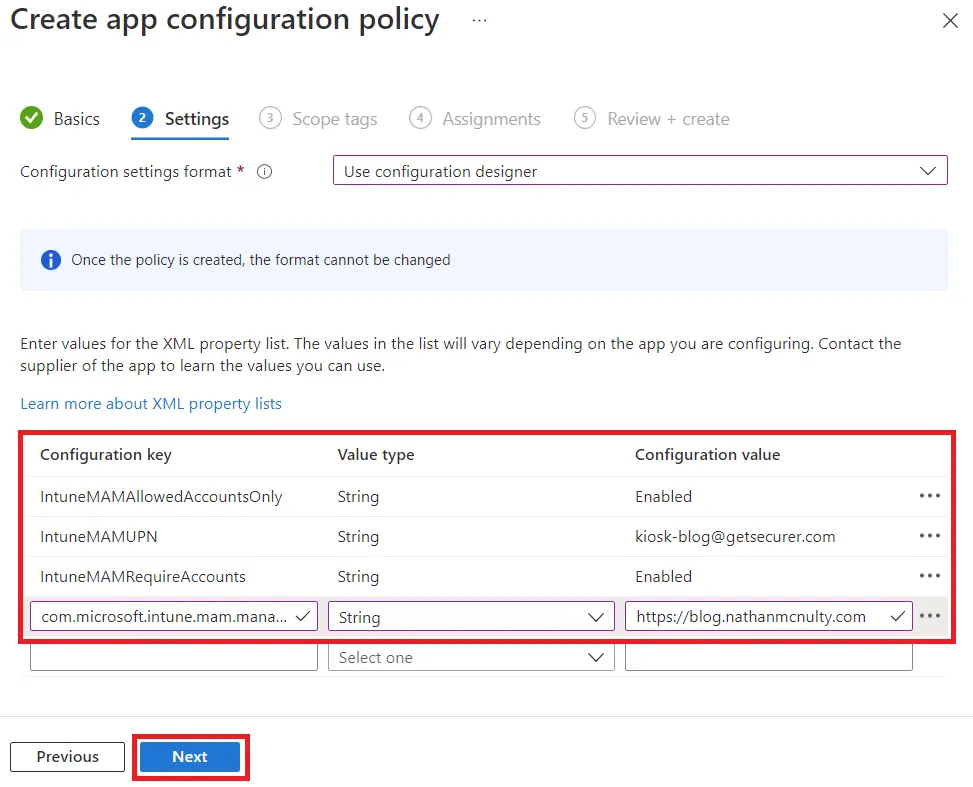 Click Next on the Settings tab when finished, click Next on Scope tags, then assign to our Kiosk security group, click Next, then Review and click Create.