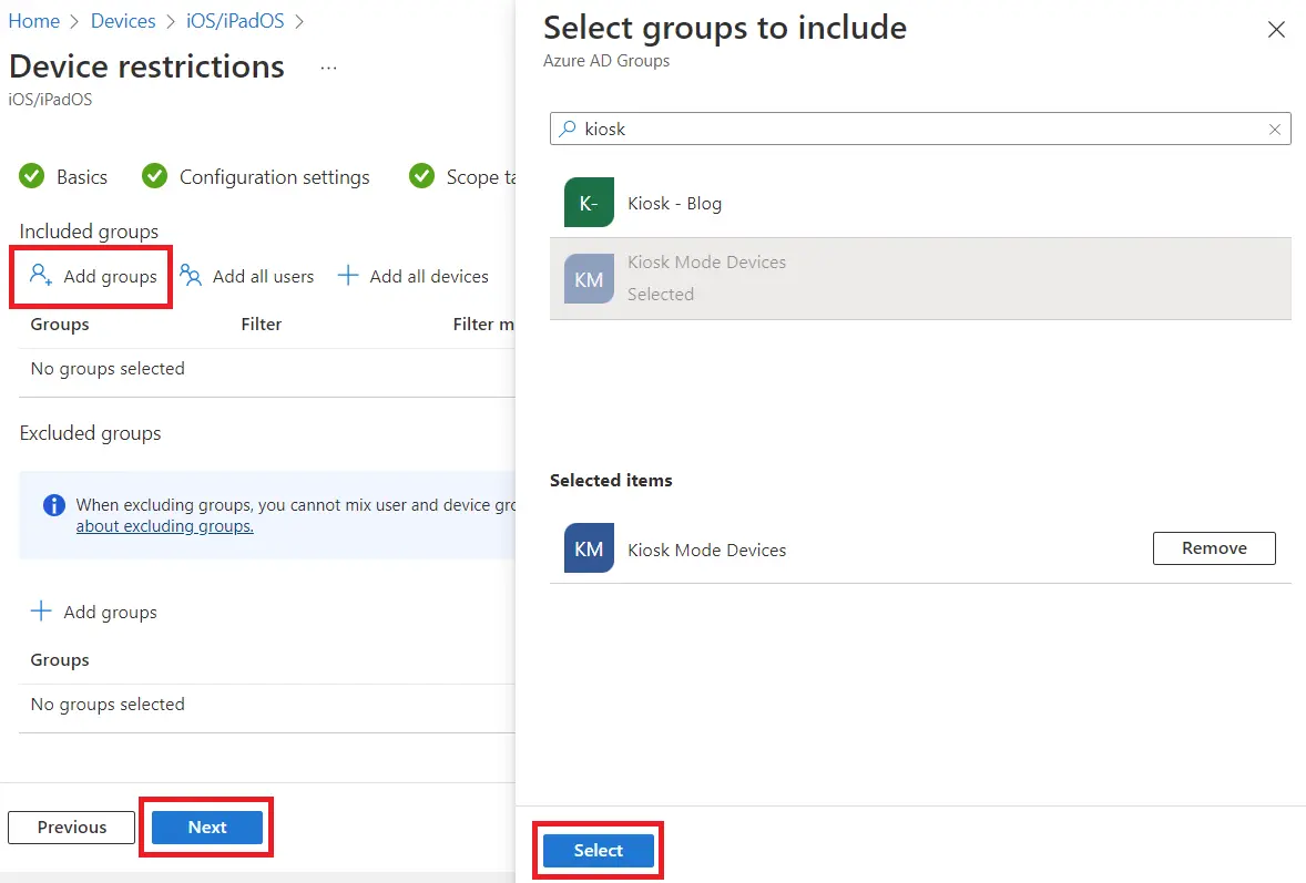 Select your scope tags if needed, then click Next. On the Assignments tab, click Add groups, search for your Kiosk group, click it in the list to add to the Selected items, then click Select. Finally, click Next, then review and click Create.
