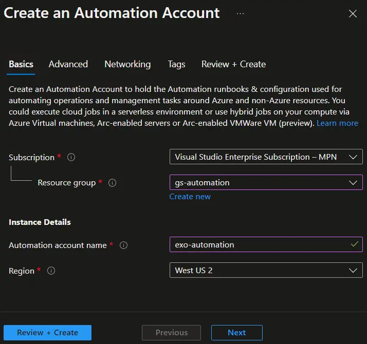 First, we need an Automation Account. If you’ve followed my previous Azure Automation guide, I would highly recommend creating a separate Automation Account for both permissions reasons and the fact that I need to update that one to use Managed Identities once Graph V2 modules adds MI support (soon!).