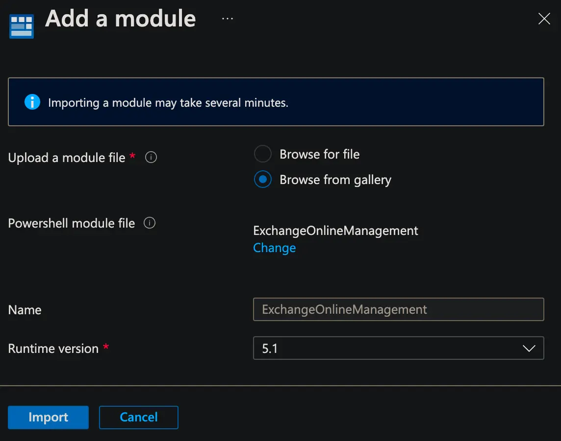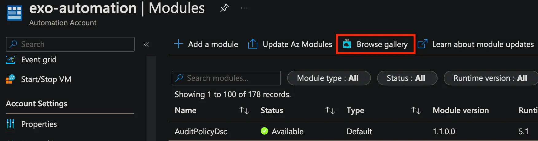 Now, that our Automation Account has the necessary permissions, let’s head back over to the Azure Portal to our Automation Account, then go Modules. We need to add the ExchangeOnlineManagement and a few Graph modules required to run our script.