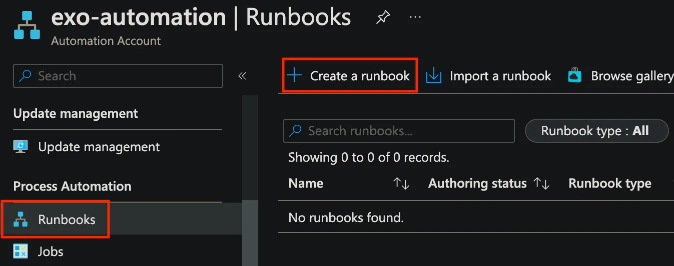 Once you are finished importing modules, scroll up a bit in the Automation Account and click on Runbooks, then click Create a runbook.