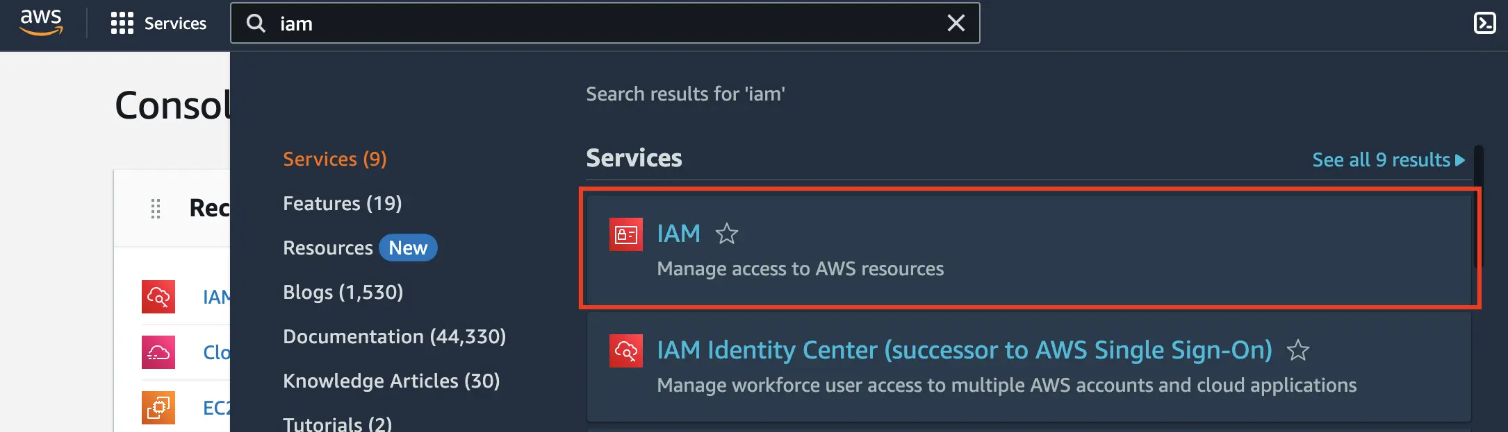 The next step is to create the Identity Provider in AWS for Azure AD. To start, search for IAM and select IAM from the list of services.