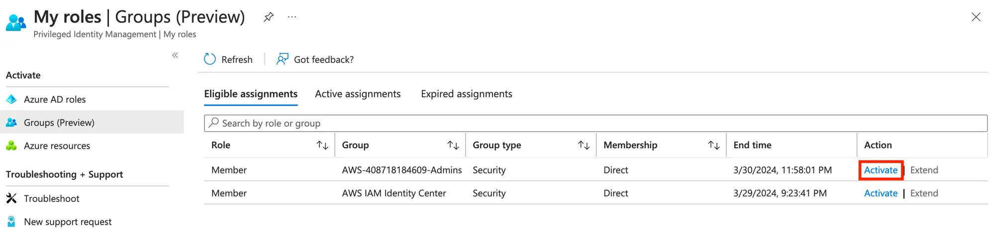 Now, let’s head on over to https://aka.ms/pim, click Groups (Preview), and then click Activate on your group.