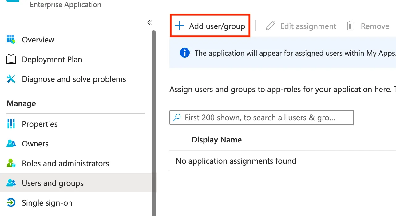 Now we’re going to assign our PIM enabled group to the application under Users and groups. Click Add user/group, then add the group you created and save.
