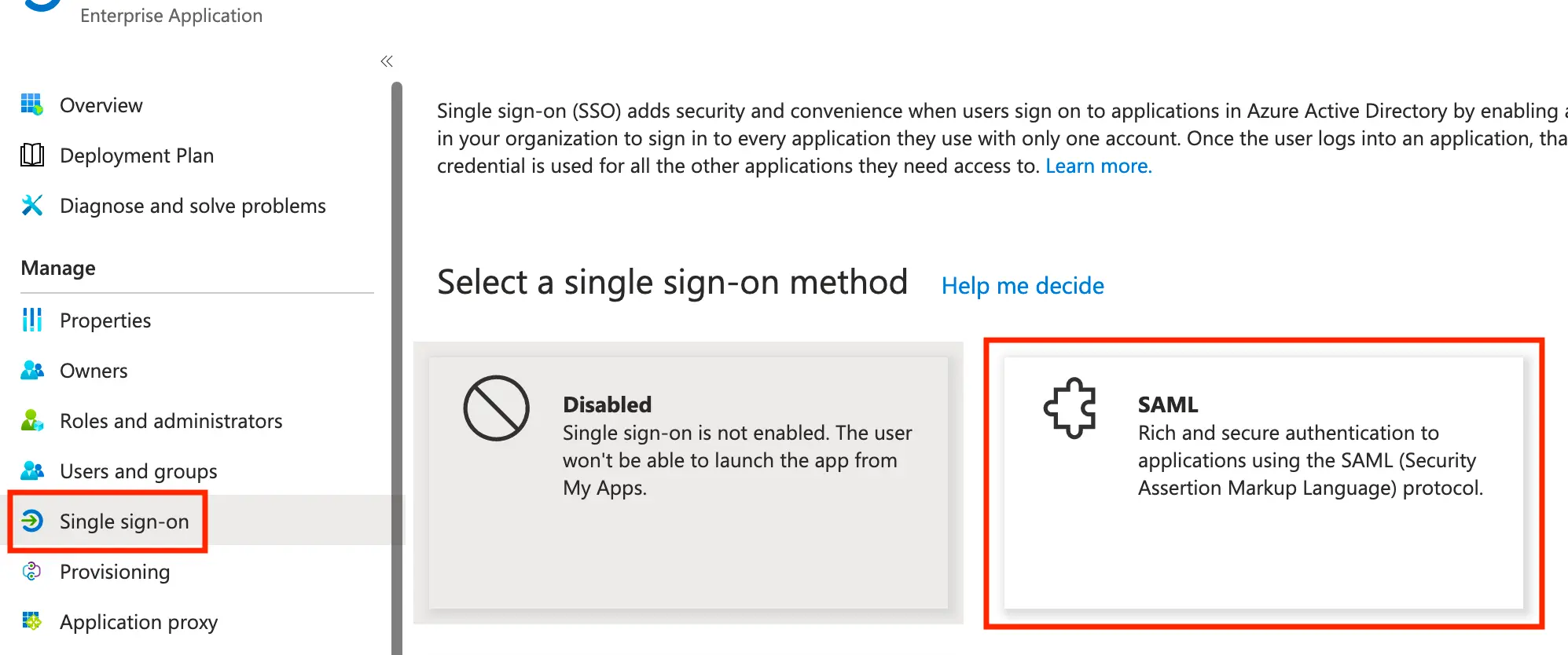 On the next page, leave SAML selected. For the provider name, I used aad in the regex pattern for the SAML token configuration, and it’s important that we use the same provider name here. Finally, click Choose file, select the metadata XML file we downloaded from Azure AD, then click Add provider.