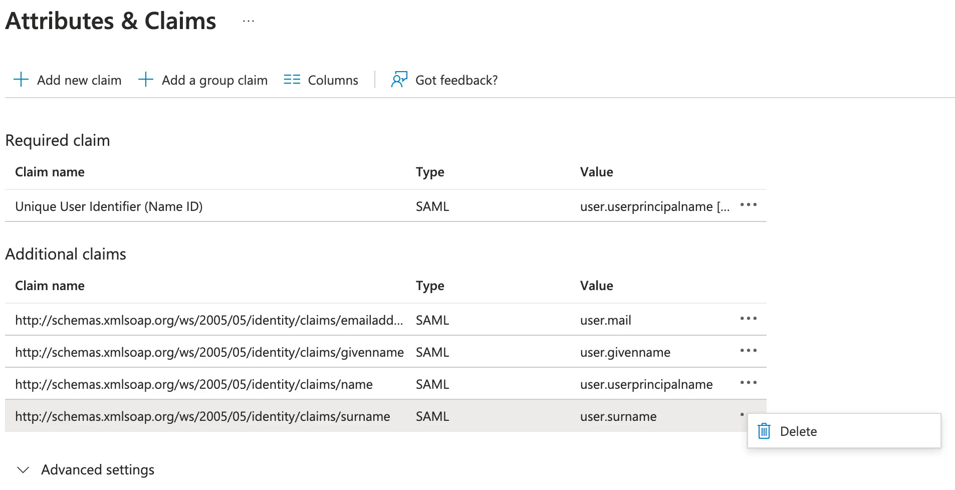 Next, let’s edit the attributes and claims section and delete the pre-defined additional claims by clicking the 3 vertical dots and clicking Delete on all 4.