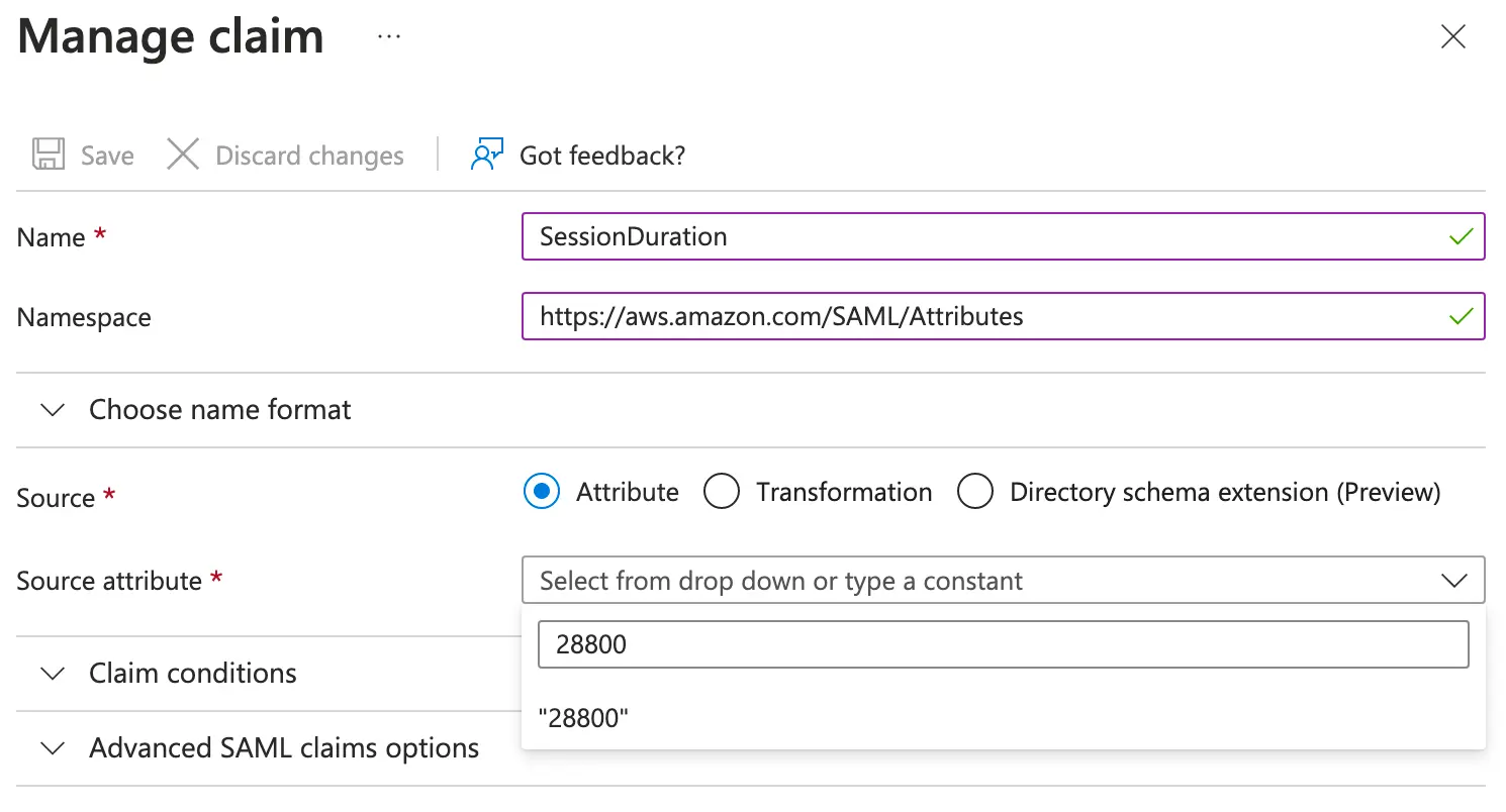 Finally, click Add new claim one last time, enter the following, and click Save. For the attribute value, manually enter the session duration you want in seconds, select the text below in quotes, and then click Save.
