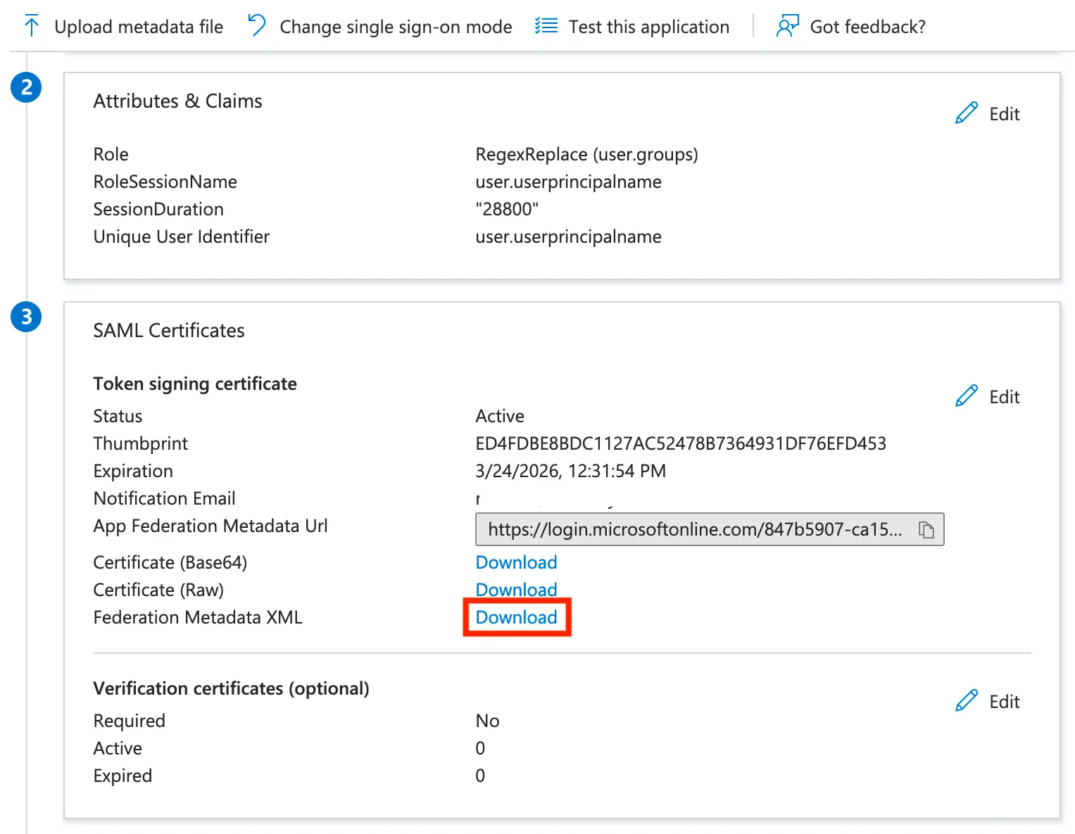 Finally, we can close the Attributes and Claims section, scroll down a little more, and download the federation metadata XML file. We will need this to upload to AWS in the next section, and for now, we’re done in Azure!