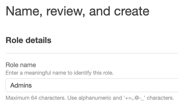 On the next page, provide the name for the role that you will use as the last part of your group name, then scroll to the bottom and click Create role.