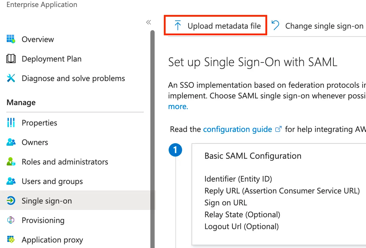Download the metadata.xml, then click Upload metadata file, and select the metadata.xml file you downloaded. Once it uploads, click Save.