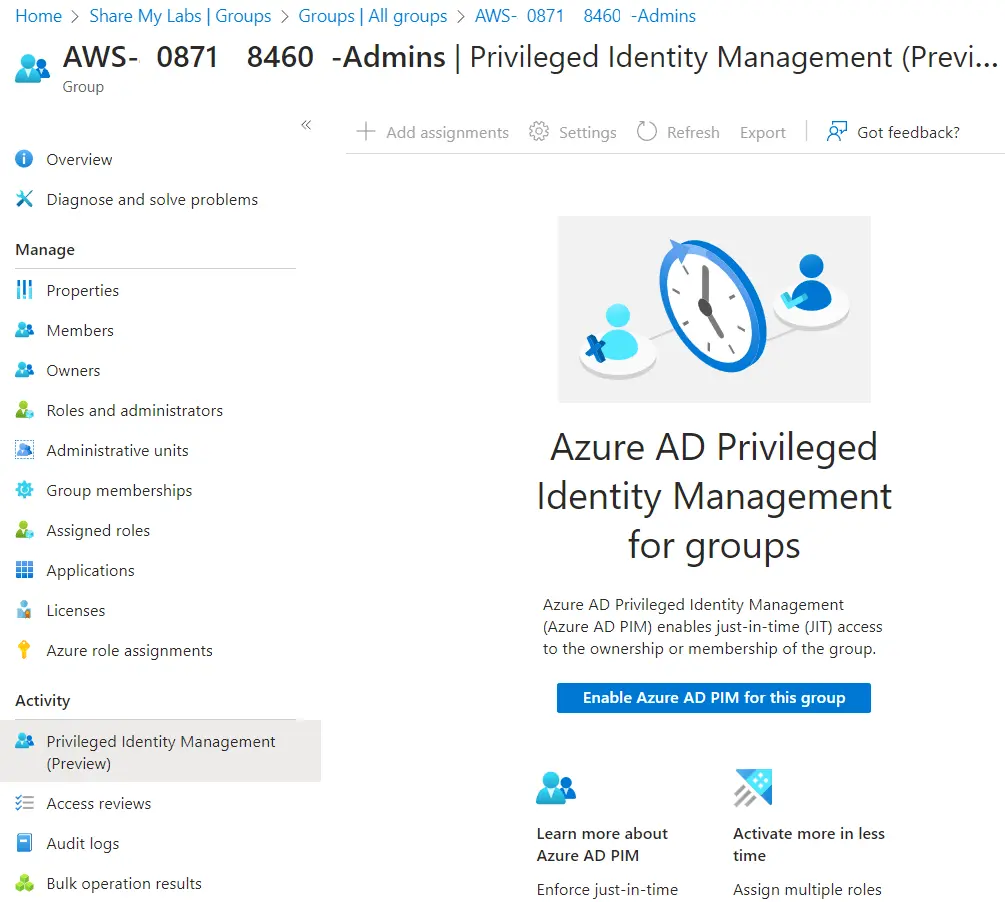 Now, let’s head on over to https://aka.ms/pim, click Groups (Preview), and then click Activate on your group.