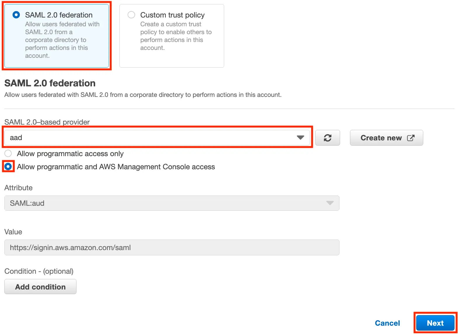 On the next screen, select SAML 2.0 federation, then select aad from the list of SAML 2.0-based providers. Select Allow programmatic and AWS Management Console access, then click Next.