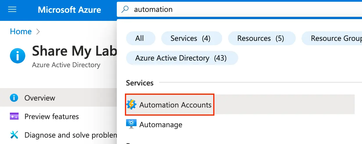 If you don’t already have an existing Automation Account that would make sense to grant permissions to delete devices, let’s create one for this purpose. Log into the Azure Portal, search for automation, and select Automation Accounts.