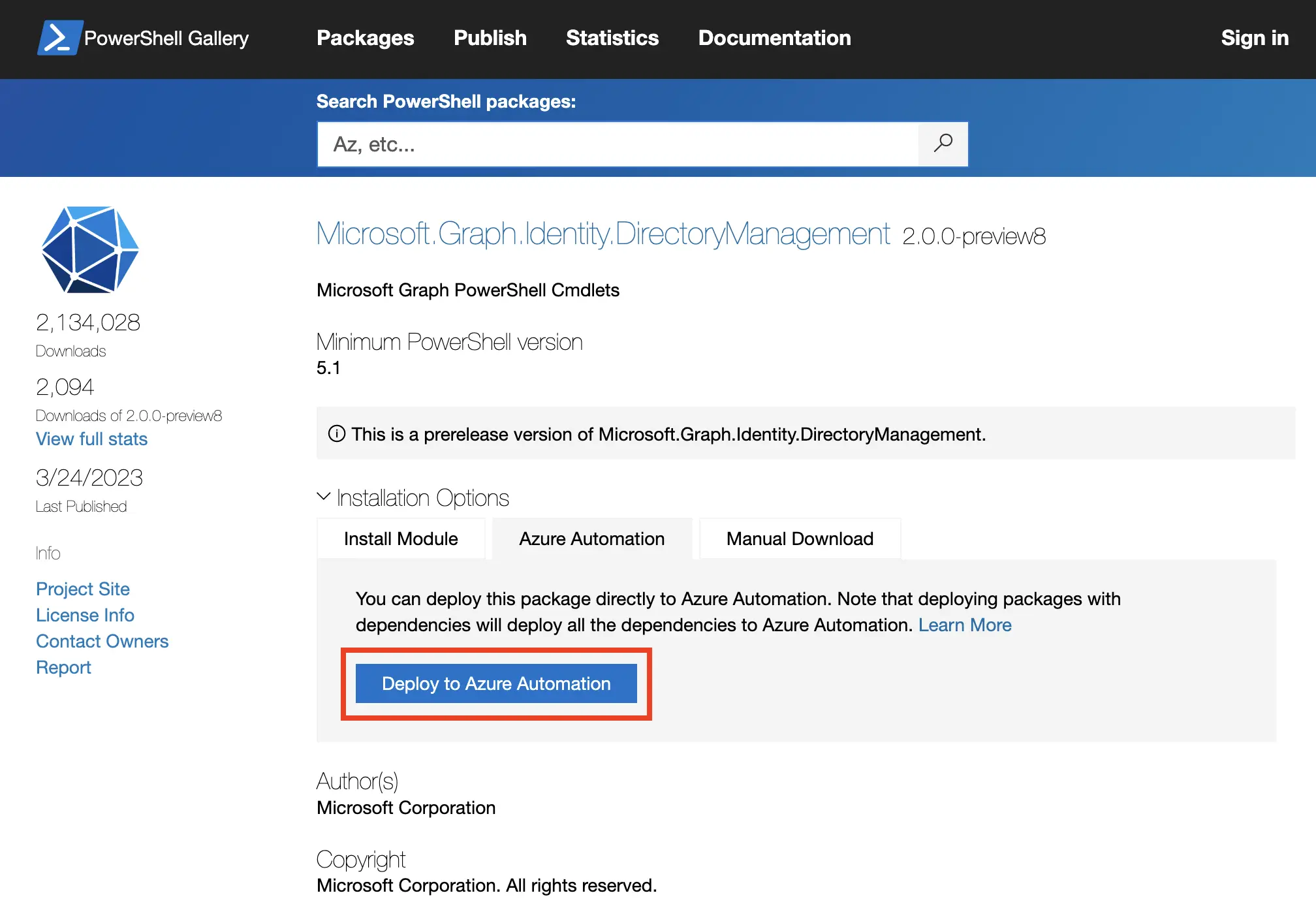 Azure Automation does not include the Graph PowerShell modules by default, so we will need to add them. If we add the modules through the gallery within Azure Automation, we will be limited to the V1 modules. Instead, we are going to add the modules through the PowerShell Gallery, select the Azure Automation tab, then click Deploy to Azure Automation.