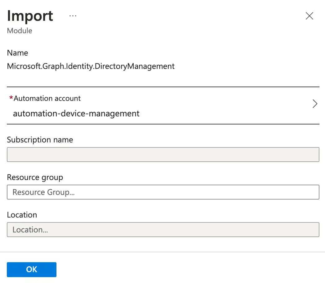 This should redirect you to Azure, and it may ask you to choose which account you want to sign in with. Once signed in, select the Automation account we created, then click OK to import. Note: It is totally normal for the fields to look blank like the below screenshot - just click OK, and the modules will import.