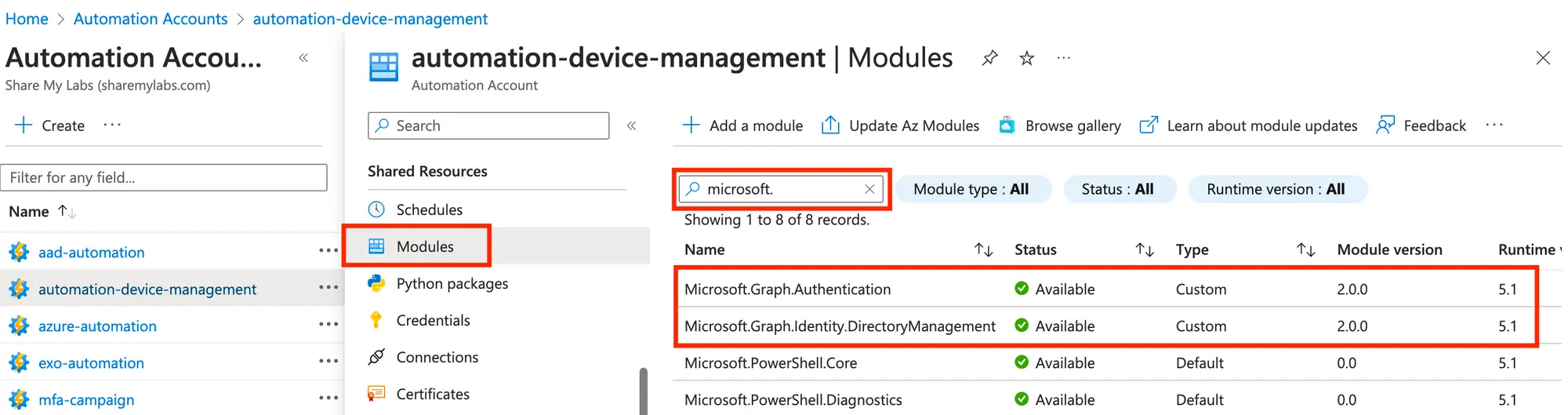 To verify that the modules imported successfully, go back to our Automation account, select Modules from under Shared Resources, then search for Microsoft. You should see Microsoft.Graph.Authentication and Microsoft.Graph.identity.DirectoryManagement listed. Unfortunately, we’re stuck with Runtime version 5.1 when using this method, so I’ll update this blog post once V2 modules are generally available so we can optimize this more.
