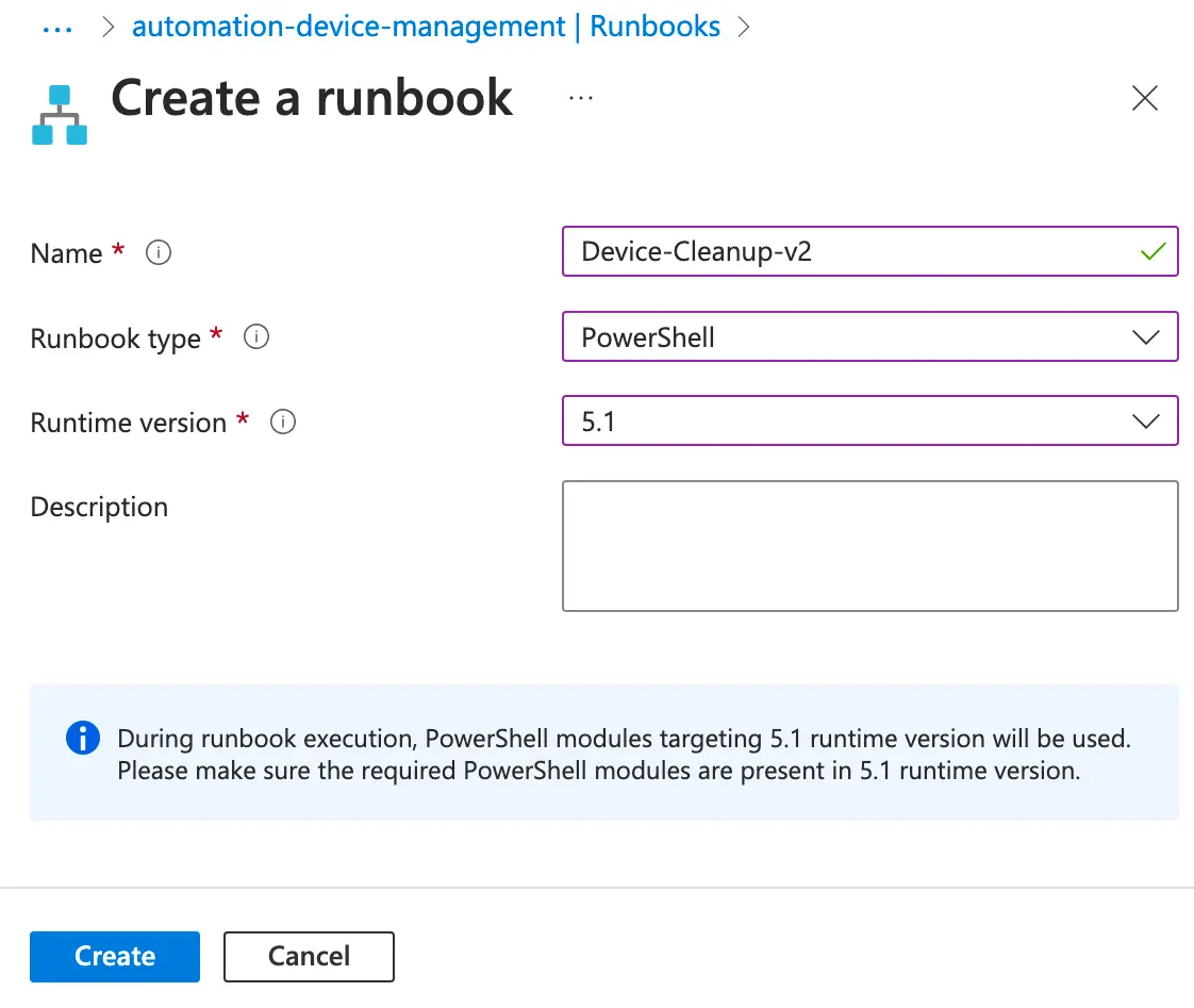Provide a name, select PowerShell for the Runbook type, and most imporantly select 5.1 for the Runtime version as it has to match the version of the modules that we imported. Click Create when finished.