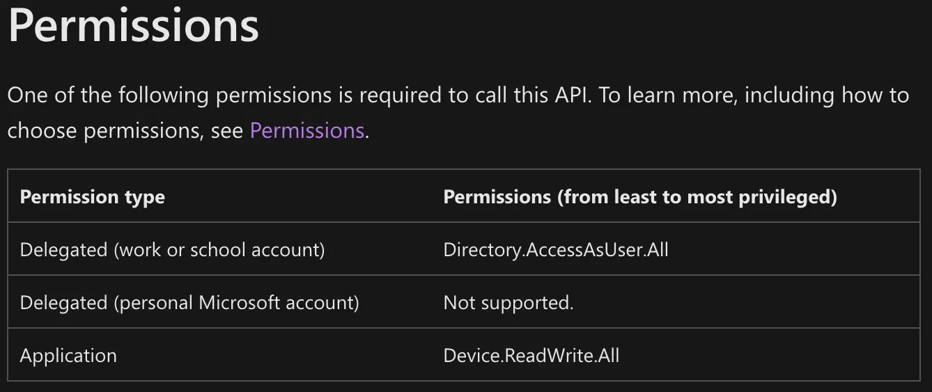 In order to delete devices, we need to assign the appropriate permissions to the System Assigned Managed Identity associated with our Automation Account. To determine what permissions we need, we can look at the Delete device API docs.
