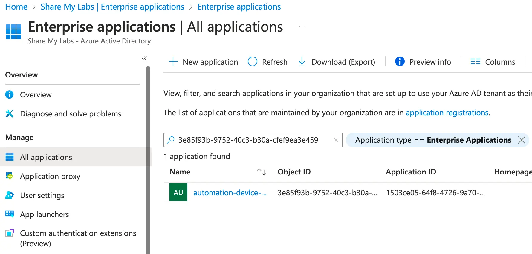 If you would like to visually verify permissions, go to Enterprise Applications in Azure AD, search for the Object (principal) ID copied from above, and then select the application representing our Automation account.
