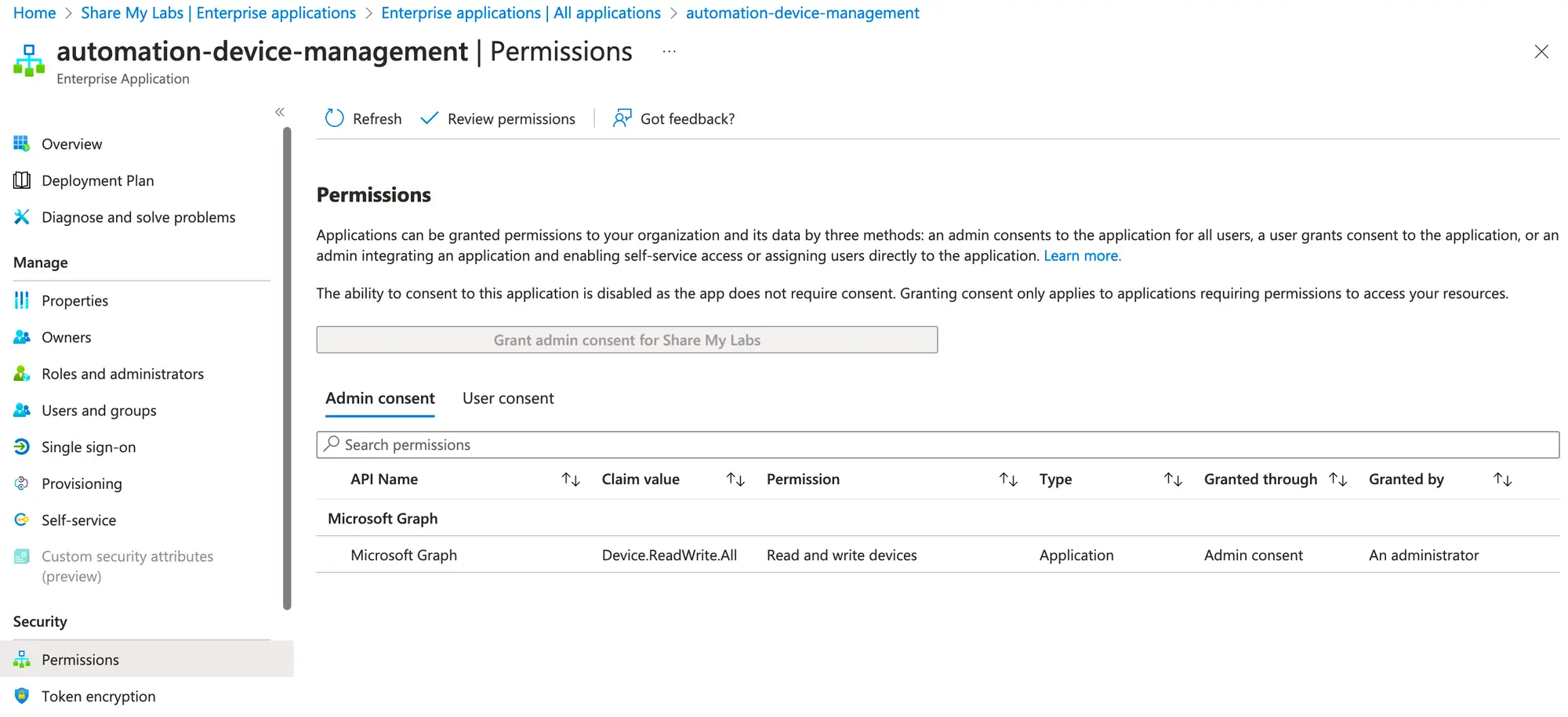 Now go click Permissions under Security, and you should see the Microsoft Graph permission of Device.ReadWrite.All using Application permissions.