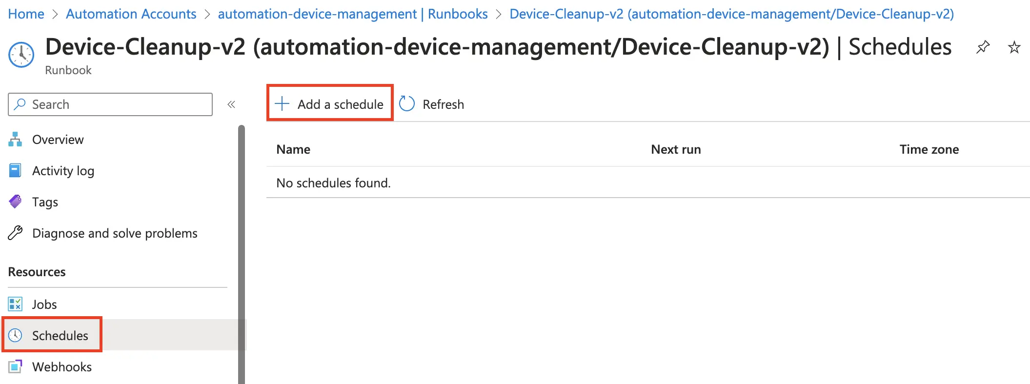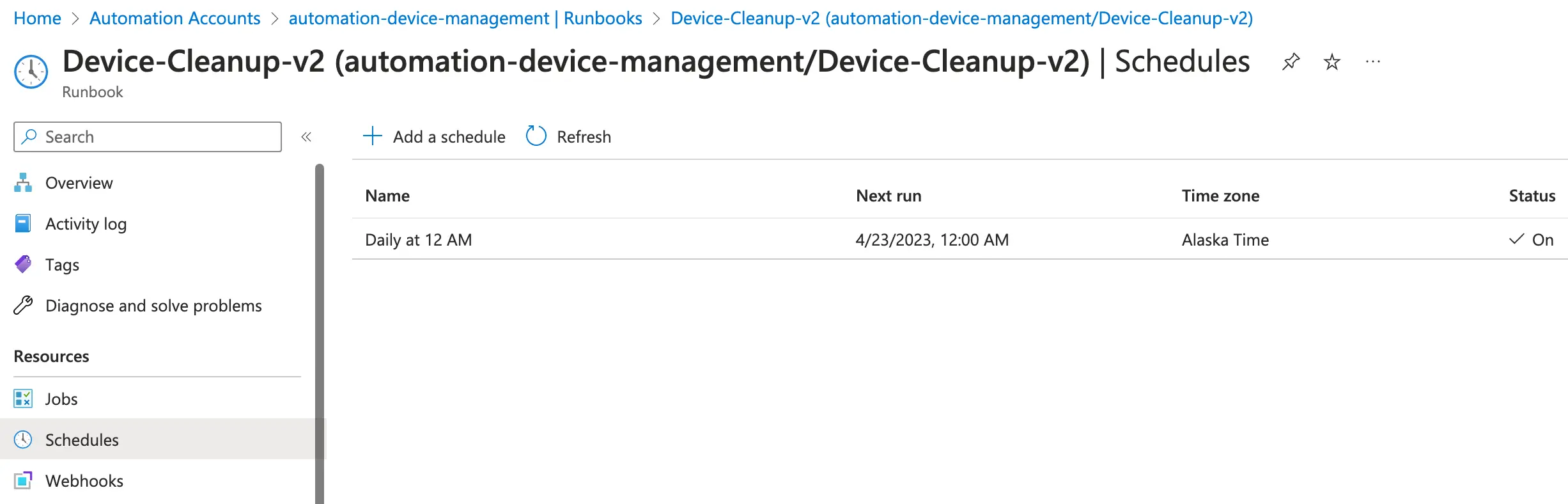 Now all we have left is to configure our script to run as often as we want. To do this, go to Schedules under Resources, then click Add a schedule.
