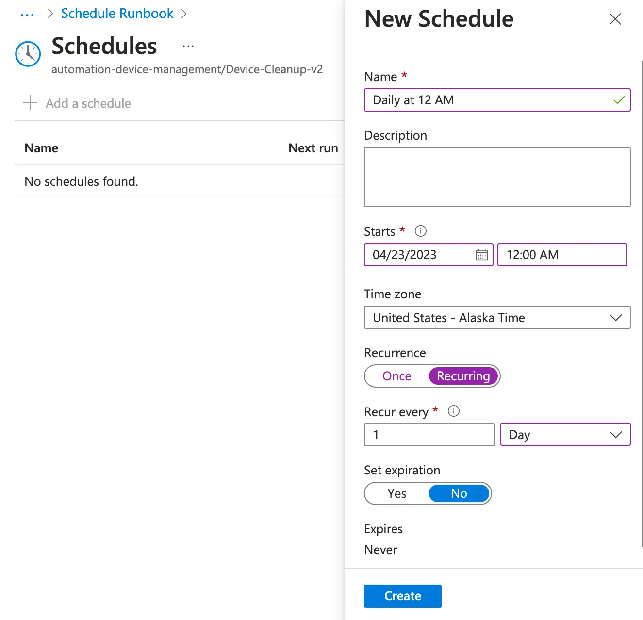 Unless you already had an Automation account with schedules set up, you’ll have to create a schedule. Click Add a schedule, then fill out the information for your new schedule and click Create.
