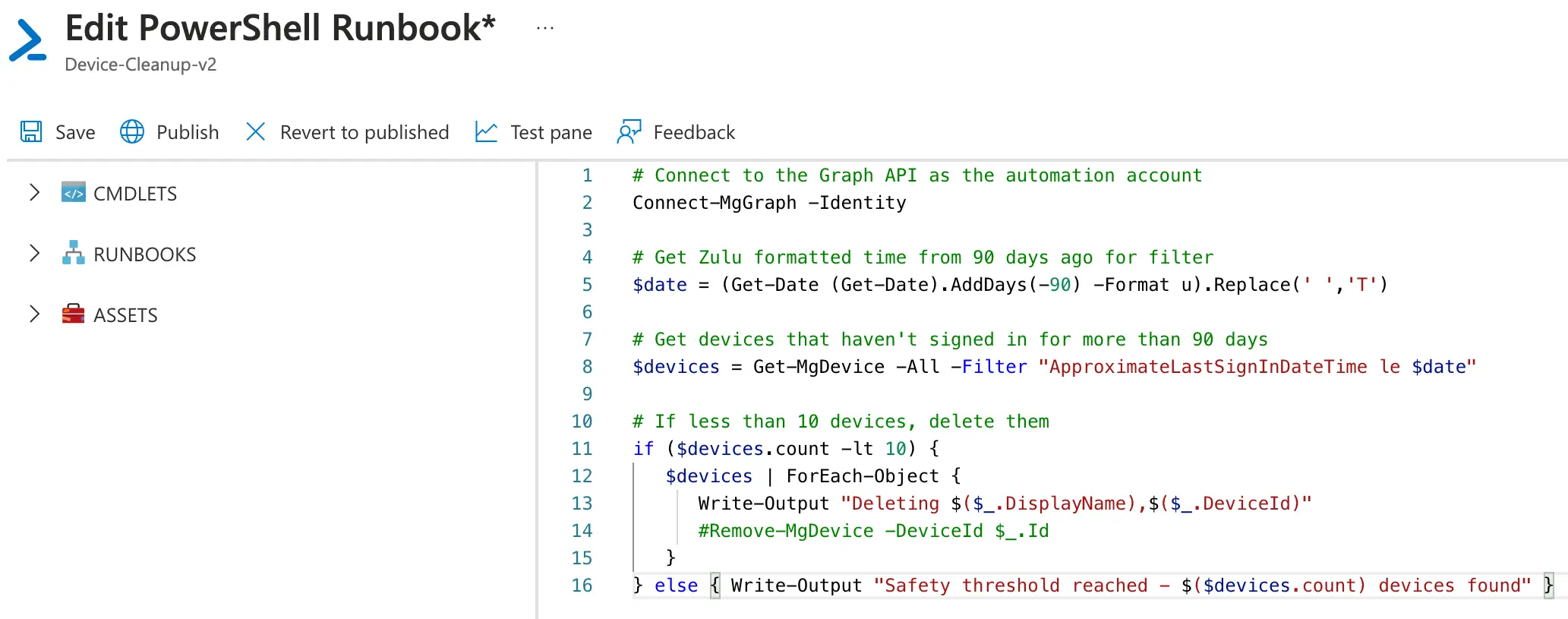 Note that I have commented out the Remove-MgDevice command, and used 90 days of inactivity with a safety threshold of 20 devices. Change the number of days/devices to fit your needs, then run it as is to see the output, review, and then you can remove the # when comfortable.