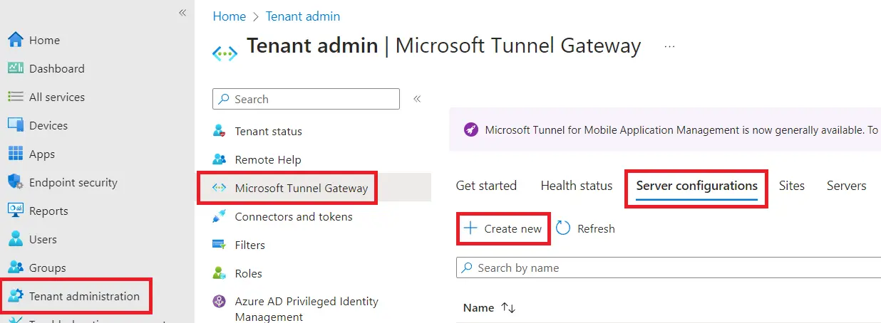 With that set up, let’s log into Intune and go to Tenant Administration - Microsoft Tunnel Gateway, then click the Server configurations tab and click Create New.