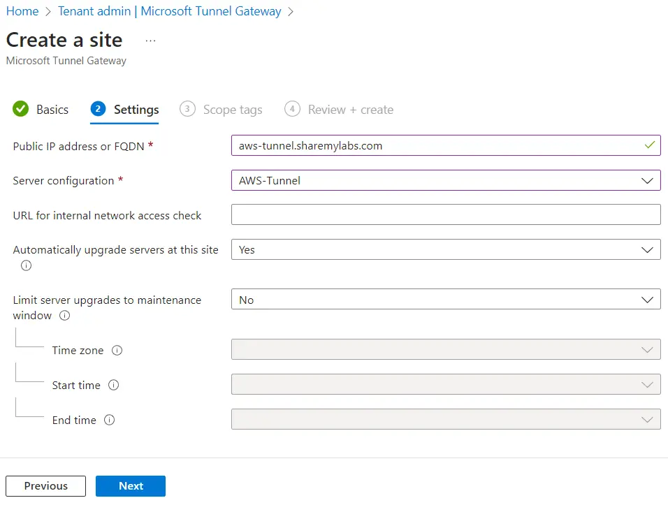 Click Next when done, specify any scope tags, then click Next, and finally click Create if everything looks good. Now click on the Sites tab, then click Create