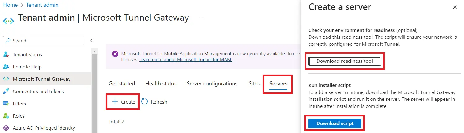 Finally, click the Servers tab, and then click Create. On the flyout, go ahead and download both the readiness tool and download the script.