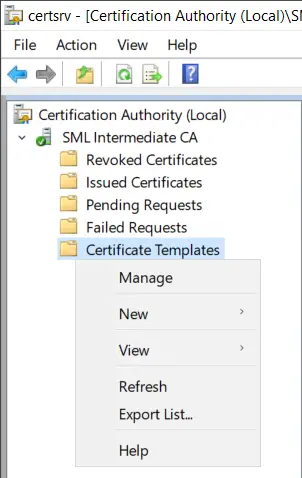To do this, we’re going to open our Certification Authority MMC, right click Certificate Templates, and click Manage.
