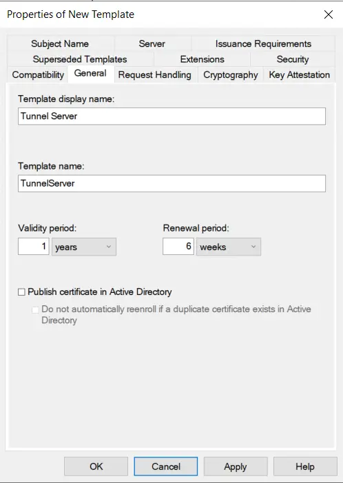 Go to the **General** tab, give it a name, and I would highly recommend a 1 year or shorter validity period for future client compatibility.