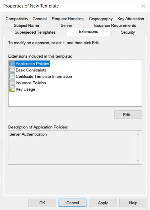 On the Extensions tab, verify Application Policies contains Server Authentication.