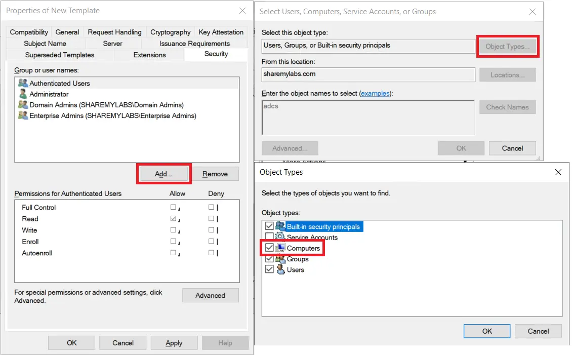 On the Security tab, click Add…, then click Object Types…, then check the box for Computers, click OK, then add the computer name you are working from, and finally click OK.