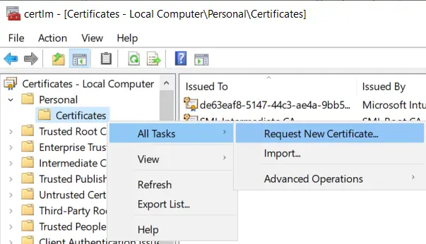 Now expand Personal and right click on Certificates, then hover over All Tasks and click Request New Certificate…