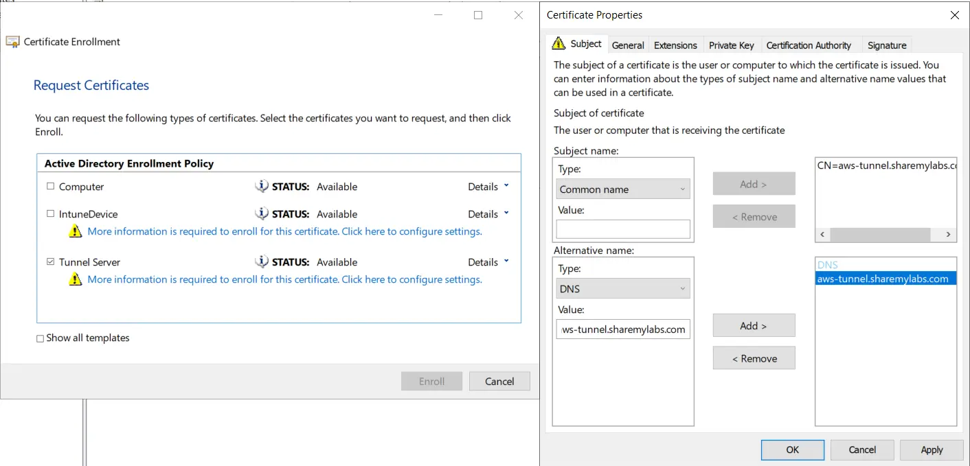 On the next screen, we should see our template, and we’ll click the warning below the template name to fill in more information. The most important part here is that the SAN **must** have DNS with the public FQDN that we used previously. Select DNS under Type, provide the FQDN, then click Add. Add a CN as well, then click OK.