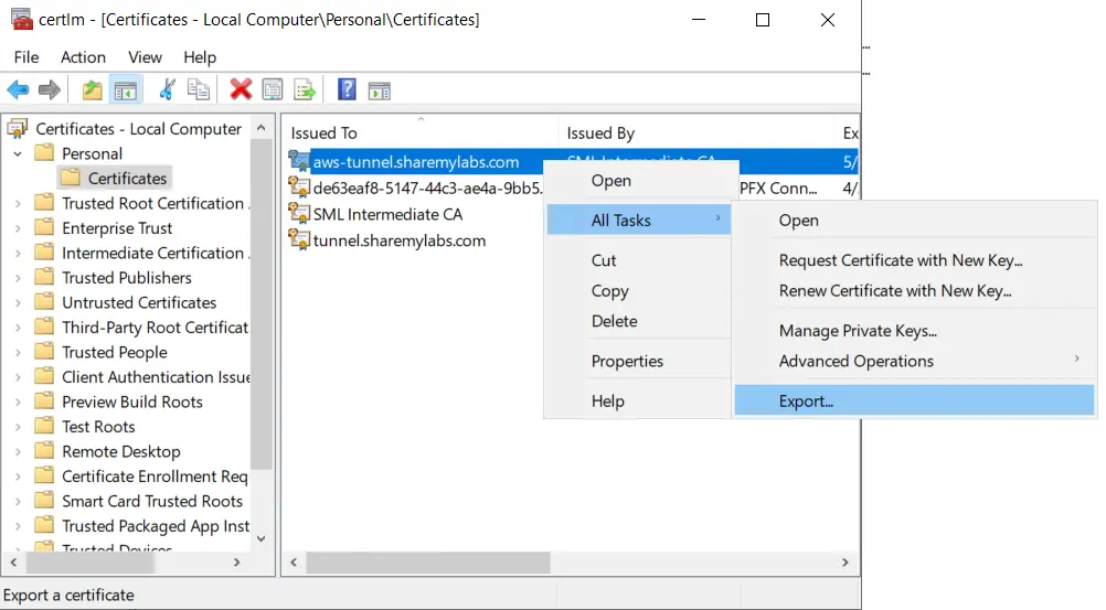Now right click on your new certificate, hover over All Tasks, and click Export…