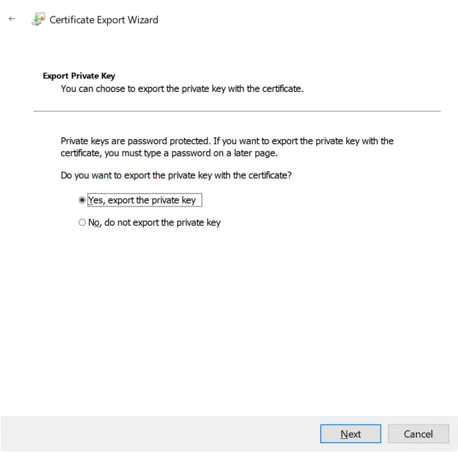 In the wizard, click Next, select “Yes, export the private key”, then click Next.