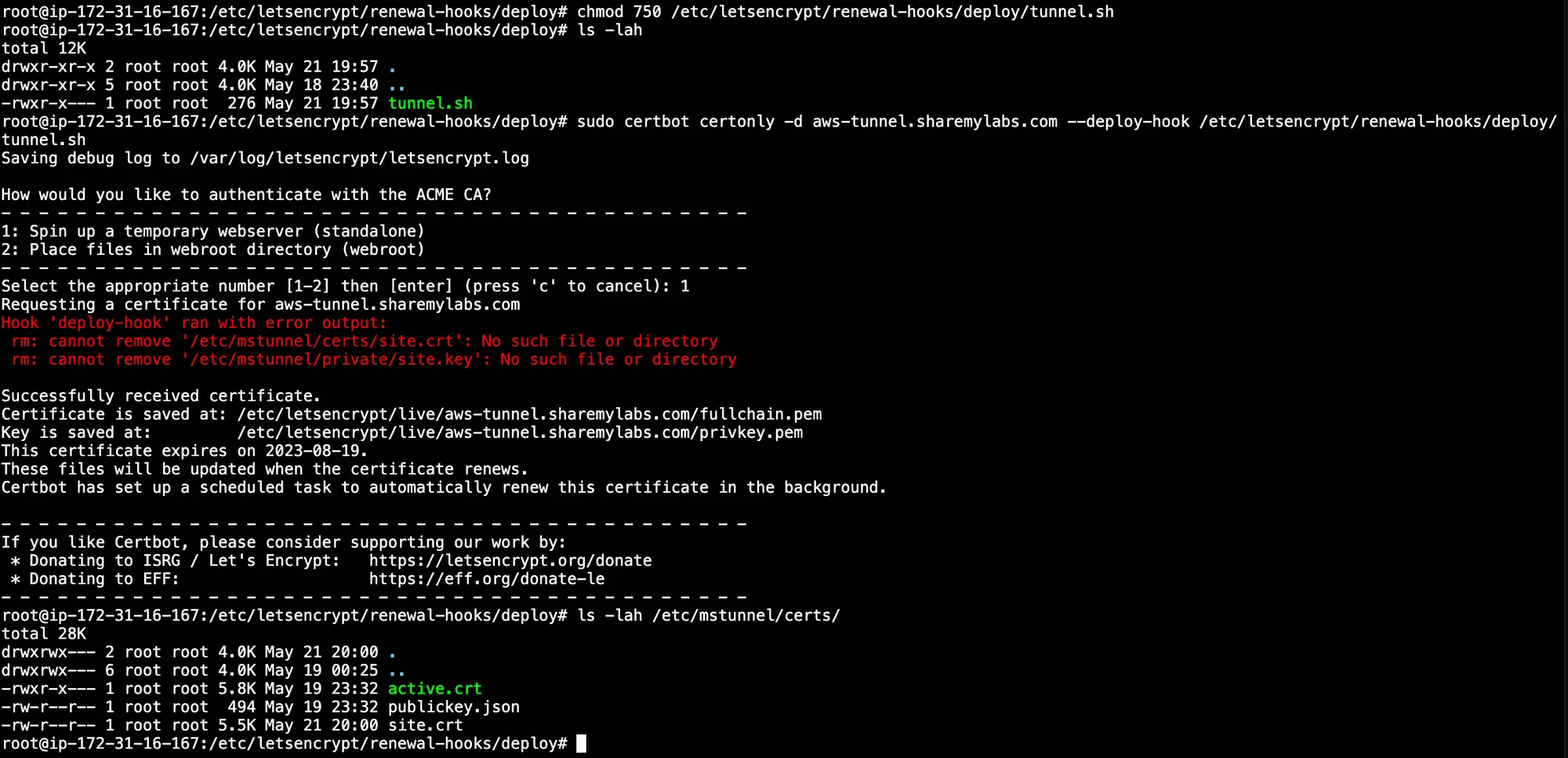 2sudo certbot certonly -d aws-tunnel.sharemylabs.com --deploy-hook /etc/letsencrypt/renewal-hooks/deploy/tunnel.sh
