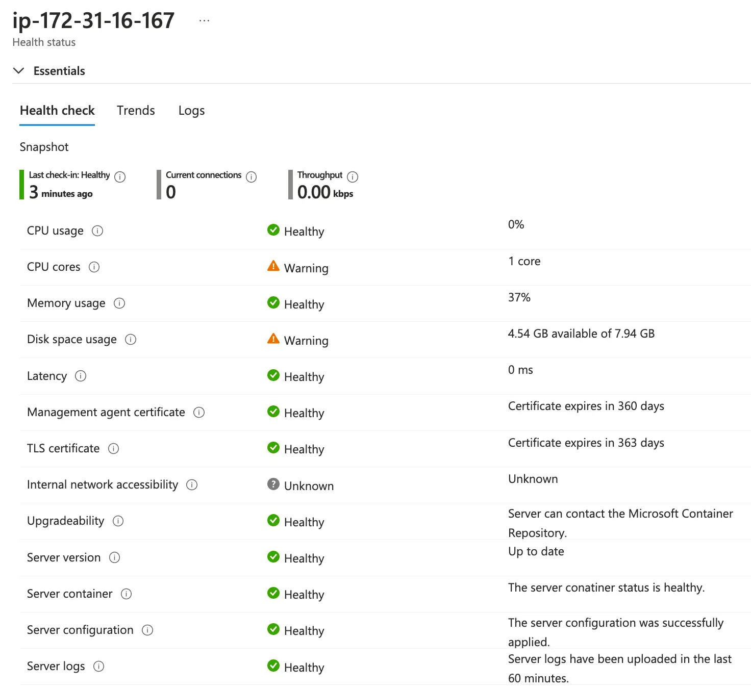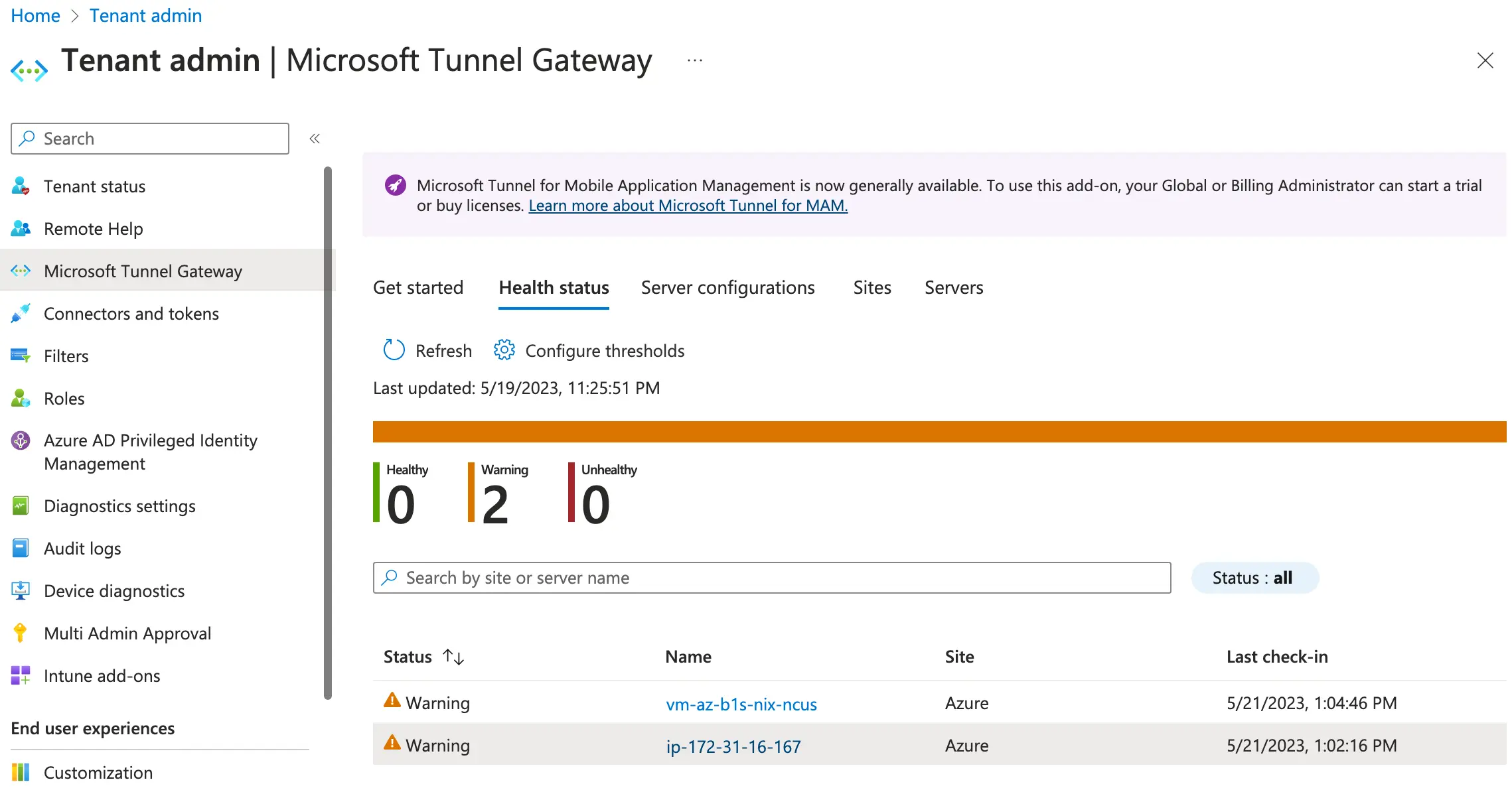 At this point, we should have a working Tunnel server, and Intune has an awesome way of presenting health information and gathering logs without needing to SSH to our servers / containers.